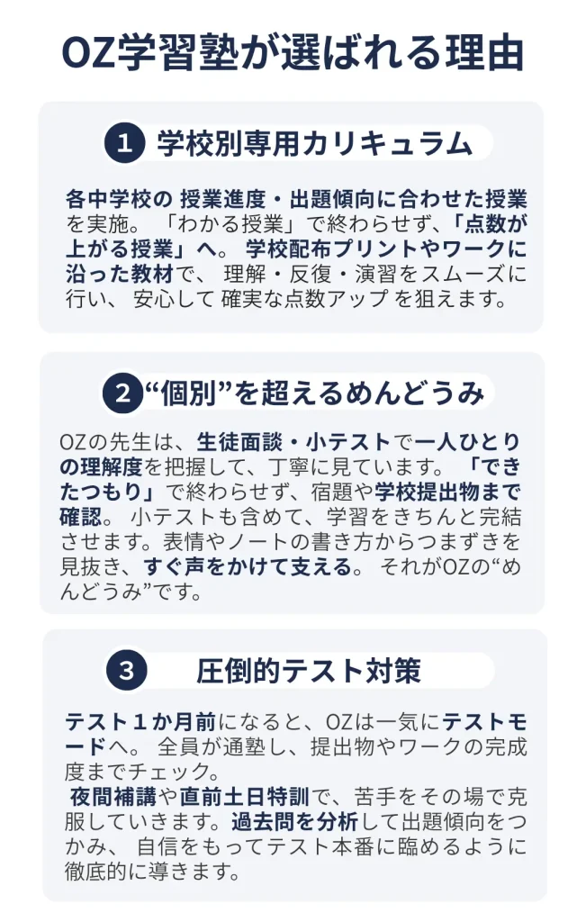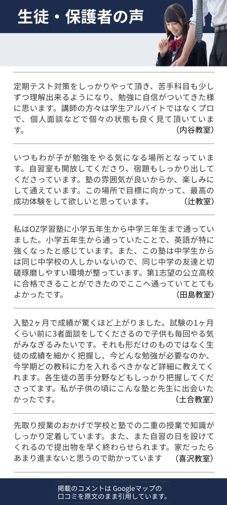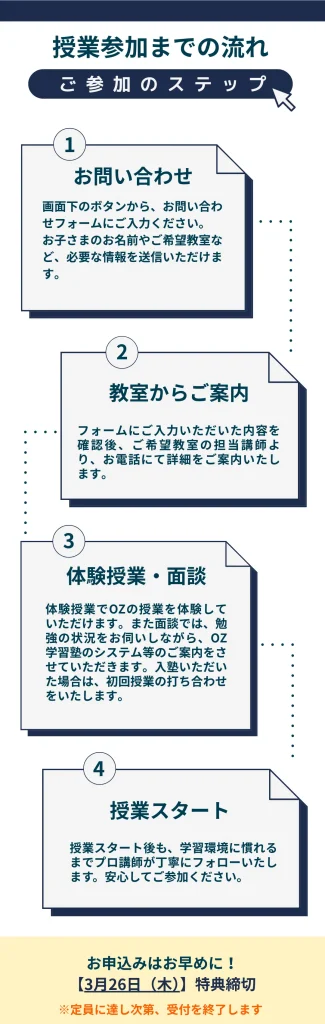 OZ学習塾では、各教室ごとに夏期講習や通常授業のご案内をしております。まずは下記よりお気軽にお問い合わせください。