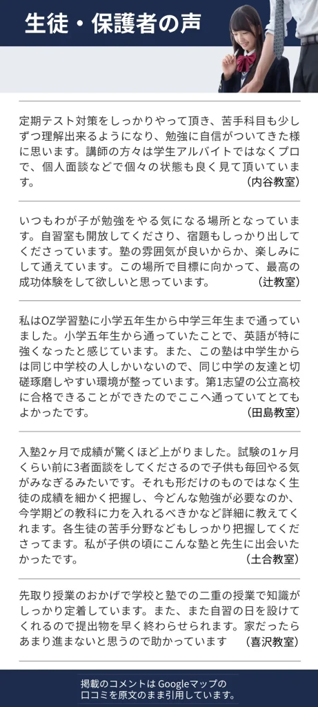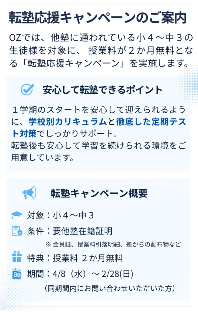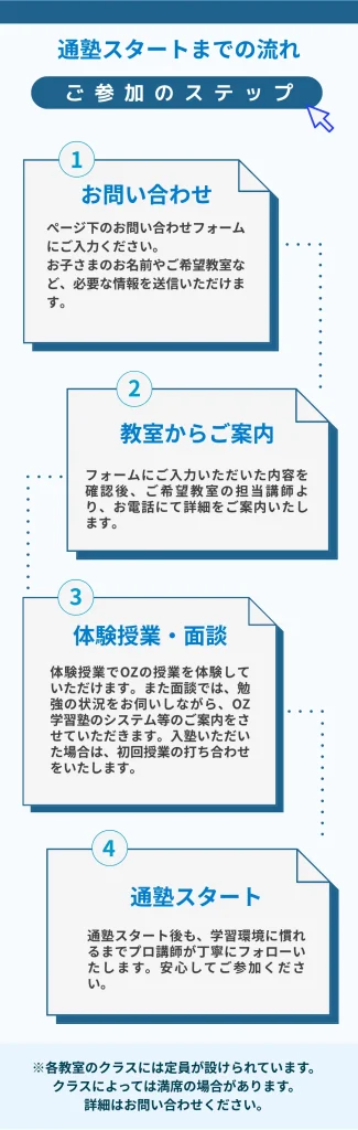 OZ学習塾では、各教室ごとにご案内をしております。まずは下記よりお気軽にお問い合わせください。